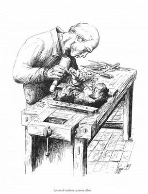 Seguii molto attentamente le varie vicissitudini della sua vita, ma i miei occhi erano costantemente attratti dai particolari più caratteristici del castello, unico per la sua originalità. Si potevano vedere teste di animali mostruosi scolpiti nella roccia, interrotte da falsi ripiani, che fungevano da credenza; in alto, sulle pareti, una serie di graffiti-in corso di lavorazione.